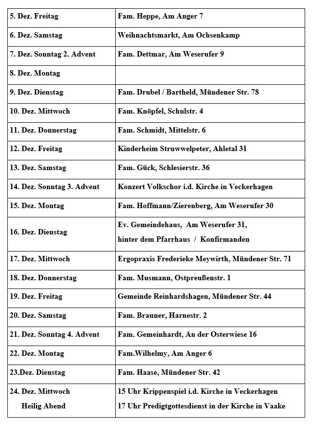 Treffpunkt: jeweils um 15 Uhr im Gemeindehaus Vaake, Am Weserufer 31